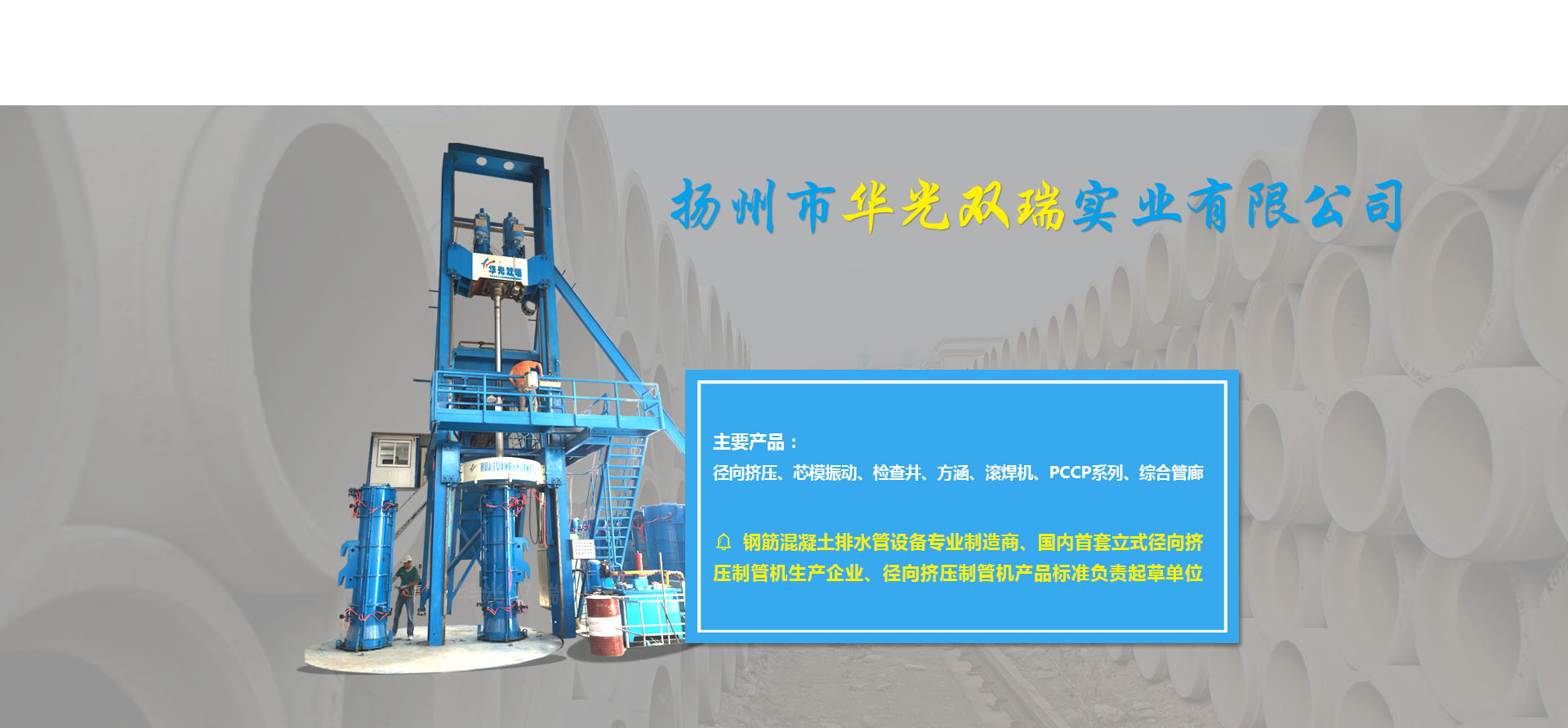 ????????揚州市華光雙瑞實業(yè)有限公司,位于中國歷史文化名城揚州市東郊江都區(qū)丁伙工業(yè)園區(qū),公司成立于2000年10月,是一家專門致力于鋼筋混凝土排水管生產裝備的設計開發(fā)、加工制造、銷售服務的專業(yè)制造商。公司2016年度被授予全國建材機械產品定點生產企業(yè),2017年度被授予中國混凝土與水泥制品協會會員單位,江蘇省認定企業(yè)技術中心,江蘇省研究生工作站,揚州市水泥制品工程技術研究中心,先后承擔過國家火炬計劃項目一項,省科技項目二項,揚州市重點研發(fā)項目一項。公司擁有自主知識產權36項(發(fā)明專利6項,實用新型專利30項),公司研發(fā)的13種產品榮獲江蘇省高新技術產品稱號。公司產品有立式徑向擠壓制管機系列、芯模振動制管機系列、檢查井系列、方涵系列、自動變徑滾焊機系列、PCCP系列、綜合管廊系列。核心產品立式徑向擠壓機2014年度榮獲混凝土與水泥制品行業(yè)技術革新一等獎,2015年度獲江蘇省機械工業(yè)科技進步二等獎,2016年度獲全國建材行業(yè)技術革新一等獎,預制混凝土檢查井生產線榮獲混凝土與水泥制品行業(yè)2017年度技術革新二等獎,2011年度立式水泥制管成型機獲混凝土與水泥制品行業(yè)技術革新三等獎。公司還是國內首套立式徑向擠壓制管機的生產企業(yè),該產品2012年起填補了國內同類產品的空白,公司2013年被國家建筑材料工業(yè)機械標準技術委員會批準為《鋼筋混凝土排水管 芯模振動制管機》《水泥制品用鋼筋混凝土管排水管鋼筋骨架滾焊機》的行業(yè)標準制定單位,2017年11月被國家建筑材料工業(yè)機械標準技術委員會批...